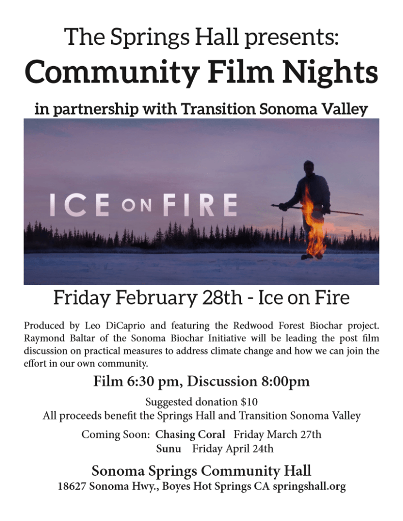 The Springs Hall, in partnership with Transition Sonoma Valley, is proud to partner on the upcoming community film night series starting Friday, February 28th. The first film, Ice on Fire, explores the accelerating impacts of climate change and ways we can address them in our own community.