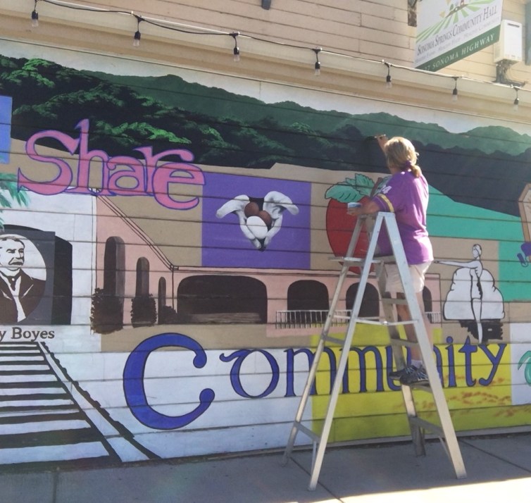 Artist Randy Sue Collins, original creator of the Springs Hall mural along with Michael Acker, at work renovating.